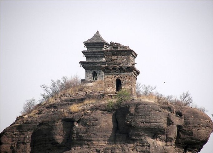 東、西、南三面墻是青磚壓縫,北墻齊縫直茬。1976年前北墻裂縫較大,寬處大約有20多公分,唐山大地震以后,磚塔不但沒倒,裂隙反而拼合。 峰頂各有磚塔一座,故名雙塔山。兩峰高低大體相同;北峰粗大,高40余米,周長74米。南峰上粗下細(xì),周長34米。雙塔山陡直而立,高不可攀,近代無人上去過,峰頂磚塔何人、何時(shí)、何故所建,不得而知,一直是個(gè)謎;今人用望遠(yuǎn)鏡觀測,北峰頂?shù)拇u塔高約2米,圓錐形,無門。南峰頂磚塔坐北朝南,高5米余,方形,邊長2米多,門高約1.5米,寬1.3米,四角置木據(jù),有鐵棍挑出,上掛銅鈴。東、西、南三面墻是青磚壓縫,北墻齊縫直茬。1976年前北墻裂縫較大,寬處大約有20多公分,唐山大地震以后,磚塔不但沒倒,裂隙反而拼合。