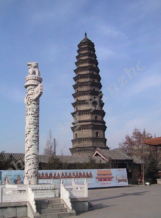 七寶塔在山西平順縣城西北23公里大云寺前。周顯德元年(公元 954年)建。通體用堅(jiān)硬青石雕造。原為七層,現(xiàn)存五層,高為六米。下三層平面八角形。第一層雕寶裝蓮花、獅子、麒麟、飛馬等。第二層雕伎樂(lè)人,體態(tài)輕盈,舞姿優(yōu)美,伴奏者栩栩如生。第三層轉(zhuǎn)角處雕絞龍柱,回旋盤(pán)繞。塔檐下飛鳳、飛仙、共命鳥(niǎo)等變化多姿。檐下周匝垂帳,正面券門(mén)上雙龍戲珠,門(mén)側(cè)侍立二天王。后面比丘半掩門(mén)。兩次間二力士分立左右。第四層周匝垂帳,前后有假板門(mén)。第五層上覆大圓蓋寶珠頂。此堪設(shè)計(jì)精巧,雕造頗佳,獨(dú)具匠心。