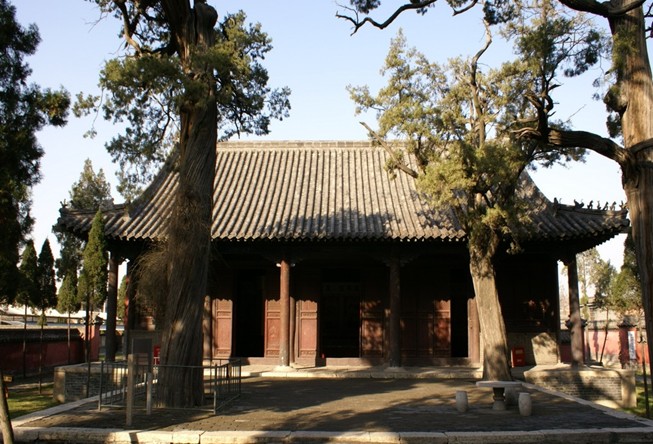 在孟廟寢殿前露臺和甬道之上,有3株古檜。據(jù)《三遷志》記載,為北宋宣和年間所植,距今已有近900年的歷史,是孟廟內(nèi)最為古老的樹木之一,現(xiàn)依然青翠蓊郁,茁壯茂盛。奇妙的是其中一株古檜,不僅樹頂干枝造型為“鹿回頭”(林默涵語),頗為奇特,而且在樹干之上的鳥洞中寄生出數(shù)株枸杞,枝繁葉茂。夏秋之際,碧綠的枸杞葉簇?fù)碇t紅的果實(shí),迎風(fēng)搖曳,妙趣橫生,煞是喜人。