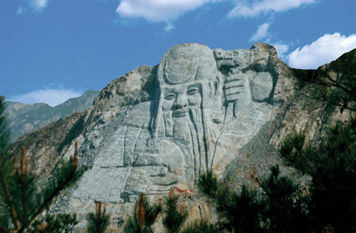 位于龜蒙頂西北側(cè),從龜蒙頂沿臺階步游路可直達拜壽臺,由此即可看到對面山崖的壽星巨雕。壽星巨雕是利用天然裸巖依山雕刻,由中央美術(shù)學(xué)院教授設(shè)計,采用明朝末年定型的壽星形象,雕像面南,為半身像, 高218 米, 頭部高108米,大腦門,白須飄逸長過腰際,一手拄鳩杖,一手托仙桃,慈眉善目, 笑逐顏開。雕像通過藝術(shù)上的虛幻處理,近看親切安詳,遠看氣勢雄偉,給人以神秘之感,為養(yǎng)生長壽勝地蒙山旅游的標(biāo)志性景點,其規(guī)模之大為世界之最。
