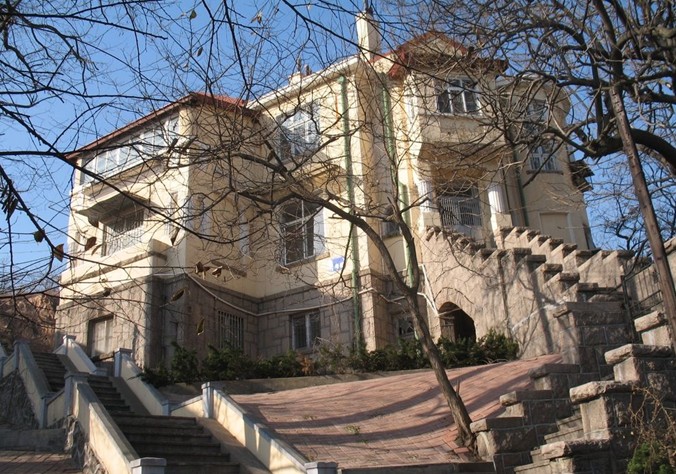 穿過兩扇雕花的鐵柵欄大門,正對著大門的是一段寬敞的沿地勢而建的臺階,拾階而上,臺階向兩邊分開,之后繞過一面造型古樸的壁墻,進入高處的院內,再通過石階才能進入居室。洪深故居是一座二層樓的德式建筑,高大的門廳,拱形窗戶,青磚灰瓦,歌特式的屋頂,十分的寬敞和氣派。通過后來的了解,這處洪深舊居也正是青島現(xiàn)代文化名人故居中,最為“闊綽”的一處。