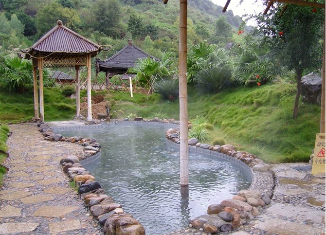 大明谷溫泉村坐落于閩清縣桔林鄉(xiāng)湯兜村,有著寬闊的水面與閩江相連,湖光山色、碧波蕩漾,可謂風(fēng)光旖旎。溫泉村內(nèi)的溫泉屬于硫化氫泉,水質(zhì)好,日出水量大,酸堿值為7.15,溫度最高為65℃。