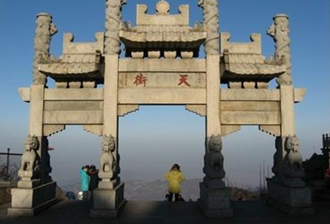 進(jìn)了南天門再上兩層臺階就是天街,天街自古以來就似懸在天上的一條街市。古代的香客,現(xiàn)在的游人都對這條街存有深刻的印象。在長約千米的天街上布滿了賓館、飯店、商鋪。據(jù)記載,天街從清代就開始繁華,當(dāng)時的一些店鋪老板用實物作為招牌,如“棒槌”、“木碗”、“鸚鵡”等。天街石坊向東路北,為乾隆行宮及唐代文學(xué)家蘇源明讀書處舊址。