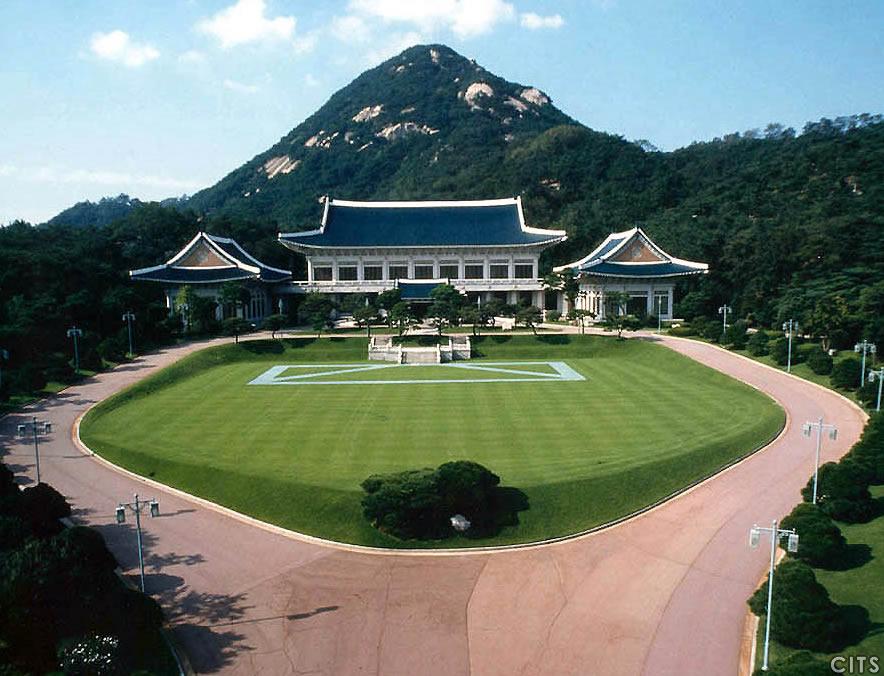 【韓文】??? 【英文】Cheongwadae/Blue House 1927年日本入侵后毀掉五云閣以外的所有建筑,建立了朝鮮總督官邸。1945年日本投降后變?yōu)檐娬L官官邸。1948年8月大韓民國成立的同時,它成為總統(tǒng)官邸并改名為景武臺(Kyung Mu Dae)。