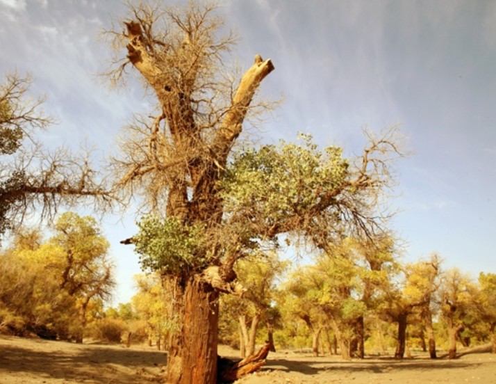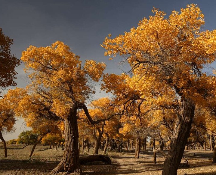 內(nèi)蒙古阿拉善盟的額濟(jì)納旗,現(xiàn)有天然胡楊林45萬(wàn)畝,是世界僅存的三大胡楊林之一,是國(guó)家自然保護(hù)區(qū)和國(guó)家森林公園。胡楊林是一個(gè)古老的樹種,被譽(yù)為“植物活化石”,有“生一千年不死,死一千年不倒,倒一千年不朽”的美譽(yù)。胡楊,又名“梧桐”,為古地中海殘遺物種,屬落葉喬木,蒙古語(yǔ)稱為“陶來(lái)”。胡楊木質(zhì)纖細(xì)柔軟,樹葉闊大清香,耐旱,生命力頑強(qiáng),是自然界稀有的樹種之一。金秋十月,額濟(jì)納是一個(gè)童話般的世界。胡楊金葉掛滿枝頭,細(xì)細(xì)看來(lái),在樹枝間竟尋不到一片異色葉子,密密匝匝,金光燦爛,至純至美;遠(yuǎn)遠(yuǎn)望去,一片片金色的胡楊把大漠裝點(diǎn)得如詩(shī)如畫,匯集成金色的海洋,吸引著大批國(guó)內(nèi)外賓客到此旅游、采風(fēng)、攝影。