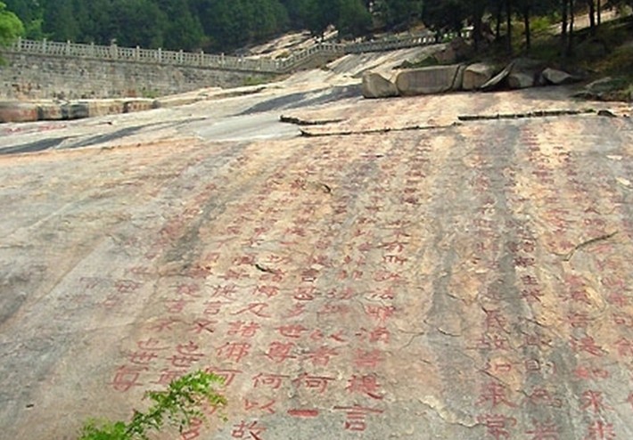 經(jīng)石峪位于泰山斗母宮東北,有岔路盤道相通,過(guò)漱玉橋、高山流水亭、神聆橋即至。峪中有緩坡石坪,上刻隸書(shū)《金剛經(jīng)》,俗稱曬經(jīng)石,明隆慶年間萬(wàn)恭書(shū)刻“曝經(jīng)石”。