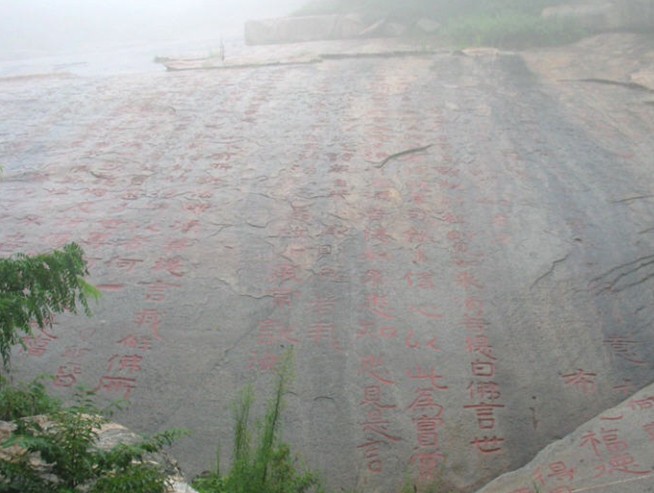 經(jīng)石峪金剛經(jīng)刻位于斗母宮東北經(jīng)石峪,是中國(guó)現(xiàn)存規(guī)模最大的佛經(jīng)摩崖刻石。 經(jīng)文刻于面積2064平方米的緩坡石坪上,自東而西刻《金剛般若波羅密經(jīng)》,采用后秦鳩摩羅什譯本,原本全1卷、32分目、5172字,經(jīng)刻只刻到15分目“特經(jīng)功德 兮”,計(jì)44行,每行125字或10字不等,凡2799字,字徑50厘米。經(jīng)刻歷千余年風(fēng) 雨剝蝕、山洪沖擊、游人踐踏、捶拓?zé)o度,已殘泐磨滅過(guò)半,現(xiàn)僅存經(jīng)文41行、 1069字(包括可認(rèn)讀的殘字和雙勾字)。