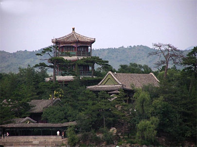山區(qū)位于山莊西北部,面積443.5萬平方米。山區(qū)占了整個(gè)園林面積的4/5。從西北部高峰到東南部湖沼、平原地帶,相對高差180米,形成了群峰環(huán)繞、色壑縱橫的景,山谷中清泉涌流,密林幽深。當(dāng)年利用山峰、山崖、山麓、山澗等地形,修建了多處園林、寺廟。避暑山莊周圍寺廟共占地47.2萬平方米,博仁寺、博善寺、普樂寺、安遠(yuǎn)廟、普寧寺、普佑寺、廣緣寺、須彌福壽之廟、普陀宗乘之廟、廣安寺、羅漢堂、殊像寺等12座金碧輝煌、雄偉壯觀的喇嘛寺廟群,是清政府為安撫中國西北蒙、藏等少數(shù)民族,加強(qiáng)邊疆管理而建造的皇家寺廟。寺廟之集中,規(guī)模之宏大,建筑之精湛,寺廟中大量佛像、祭器制造技藝之高超,使其成為藏傳佛教圣地之一。山區(qū)多處園林解放前多遭破壞,但現(xiàn)在山區(qū)景物仍然十分迷人,其中最引人注目的是遙相對立的兩個(gè)山峰上的亭子,一個(gè)叫“南山積雪”,一個(gè)叫“四面云山”。在亭子上遠(yuǎn)眺,山莊的各風(fēng)景點(diǎn),山莊外的幾座大廟,以及承德市區(qū),周圍山上的奇峰怪石,都可以一覽無余。在另一座山峰上還有一座亭子叫“錘峰落照”,在這里磬錘峰首先映入眼簾,每當(dāng)夕陽西照,磬錘峰被紅霞照得金碧生輝,故名“錘峰落照”。