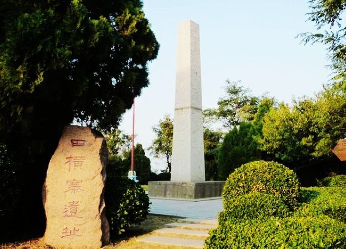這里是田橫寨遺址,為長方形,東西長120米,南北寬80米。南側(cè)的“田橫寨遺址”石碑為書法家大康題寫。這座田橫紀(jì)念柱高7米,采用花崗巖雕鑿而成。四面浮雕分別表現(xiàn)了“聚事”、“演練”、“進(jìn)攻”、“建國”四個(gè)場面。西側(cè)是一座田橫雕像。他面北而立,氣宇軒昂,象似在高呼“吾豈能北面而事臣?”雄姿凜然,氣壯山河。
