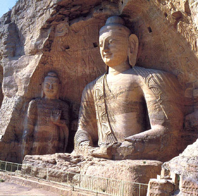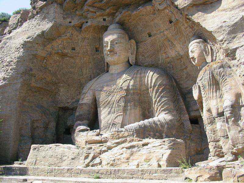 第二十窟,窟前帶大約在遼代以前已崩塌,造像完全露天。立像是三大佛,正中的釋迦坐像,高13.7米,這尊佛像面部豐滿,兩肩寬厚,造型雄偉,氣魄渾厚,為云岡石窟雕刻藝術(shù)的代表作。