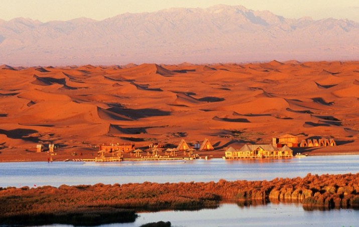 騰格里沙漠是中國第四大沙漠,也是現(xiàn)在流動(dòng)速度最快、周邊人口密度最大的沙漠,是沙塵暴的主要發(fā)源地之一。月亮湖是騰格里腹地的純天然湖泊,也是一個(gè)完全處于原始狀態(tài)的沙漠綠洲。月亮湖有三奇:一奇是形狀酷似中國地圖。站在高處沙丘一看,一幅完整的中國地圖展現(xiàn)在眼前,蘆葦?shù)姆植几菍⒏魇^(qū)一一標(biāo)明。二奇是湖水天然藥浴配方。面積三平方公里的湖水富含鉀鹽、錳鹽、少量硭硝、天然蘇打、天然堿、氧化鐵及其它微量元素,與國際保健機(jī)構(gòu)推薦藥浴配方極其相似。湖水極具生物凈化能力,能迅速改善,恢復(fù)自然原生態(tài)本色。三奇是千萬年黑沙灘。在長達(dá)一公里、寬近百米的天然浴場(chǎng)沙灘,推開其表層,下面是厚達(dá)十多米的純黑沙泥,其質(zhì)地遠(yuǎn)超死海的黑泥,更是天然泥療寶物.