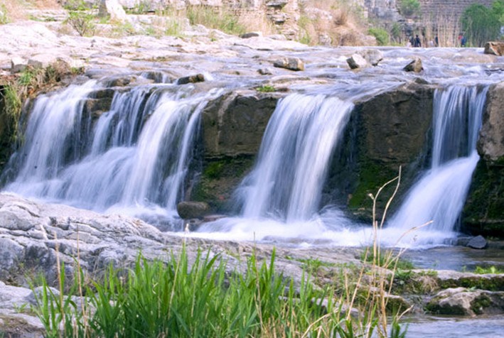 從這里往下游不到一里地,是“土泉瀑布”,它是峨莊瀑布群中最大的一個瀑布。巨大的水流從十幾米高的壩上泄到河岸的亂石上,激起的浪花又形成了許多樣式不同、大小不一的瀑布,最后跌落在山谷里。這些瀑布因自然地勢不同上承下接,形成了層層疊疊的小瀑布,連成一片,大珠小珠落玉盤,非常壯觀。這里是吸引游人最多的地方,為了便于觀賞,在下邊的河谷中建起了三個觀瀑亭,站在觀瀑亭上抬頭望去,還真有點“遙看瀑布掛前川”的味道。