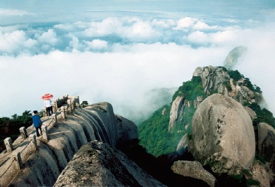 登上天池峰頂,可以領(lǐng)略一下“會當(dāng)凌絕頂,一覽眾山小”的氣概。這里視野寬闊無比,景色十分壯麗。是觀日出、云海、佛光、晚霞的最佳方位。天晴之時,極目遠(yuǎn)眺,飛來峰、銜珠峰,五指峰,山連天際;煉丹湖如同一面銀光閃閃的鏡子被潛河、皖水兩條銀鏈夾在中間;大龍窩、后山、東關(guān)諸峰如同一個個土丘,盡收眼底。
