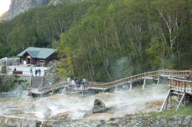 著名的長(zhǎng)白溫泉,距瀑布北約一公里處,面積1000多平方米,30多個(gè)泉眼終年蒸氣彌漫,散發(fā)著熱氣,水溫高達(dá)82℃。因泉水中含有較多的硫氣氫氣體,溫泉底部常有許多氣泡向上翻滾,并發(fā)出開鍋似的響聲,泉水流出后在泉邊形成黃色的硫華。