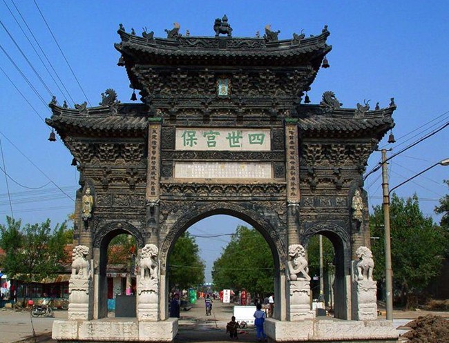 四世宮保坊位于山東省淄博市,建于1619年(明萬歷四十七年),系磚石結(jié)構(gòu),呈中間高左右低的宮殿式。面闊9.2米,進(jìn)深3.33米,高15米,拱門洞兩側(cè)有石獅8個。拱門、楹柱等上面雕有飛禽走獸、山水花卉,特別是磚砌圓柱頂部的4個浮雕人物,栩栩如生,顯示了明代雕刻家的精湛技藝。