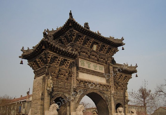 “ 四世宮保” 磚牌坊,面向南北,跨街而立,該坊為磚石結(jié)構(gòu),以磚為主。坊高 15 米,面寬 9.2 米 , 進(jìn)深 3.3 米 , 占地面積約 30 余平方米 . 其形式為中間高 , 兩邊底的宮殿式樣。該坊自下而上的構(gòu)造是:最下面設(shè)基座,其基座橫跨于大街兩側(cè),由巨型方石砌成,分有上、中、下三層,每層四周均有精致的浮雕,底層雕有蓮瓣;中層雕有云朵;上層雕有龍駒、麒麟、松鹿、棄獅、靈芝、行云等走獸和景物,姿態(tài)萬千,栩栩如生,基座之上,開拱門三孔,中孔一洞大,橫跨約 4 米,可以行人通車,左右兩洞小,寬約兩米,對稱和諧。各門楣雕有二龍戲珠,活靈活現(xiàn)。尤其是拱門兩側(cè),世石基座上雕刻的 8 尊石獅,分距前后兩面,雌雄各 4 ,各見情態(tài),生動活潑。雄獅是按銹球,回首張望,雄姿勃發(fā);雌獅撫抱幼獅,俯首凝望,極盡母愛之情。中間大拱門之上,鑲嵌有上、下兩塊橫幅石匾,下為敘功匾、鐫刻著王氏祖孫四代的名瑋、職銜和誥贈。敘功匾以上之匾額,鐫有 " 四世宮保 "4 個大字,字體端正,筆力遒勁,相傳是明代大書法家董其昌書寫。