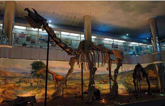 巨犀化石陳列廳展示的主要內(nèi)容是1993年在鄯善出土的一具巨犀——“吐魯番美麗巨犀”的化石骨架。這是世界上發(fā)現(xiàn)的最完整的一具巨犀化石骨架。[3]