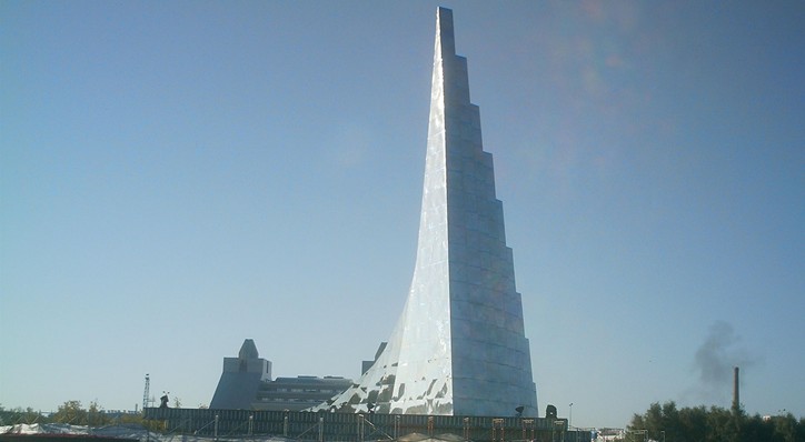 廣場內(nèi)的主體雕塑命名為“騰飛”,她既像一個翅膀,又像一頁角帆,她高27米,采用鏡面不銹鋼板制成,耀眼發(fā)光,象征大慶油田蓬勃向上的氣勢,充分展示了大慶石油工人開拓進(jìn)取,創(chuàng)造美好未來的抱負(fù)與理想。