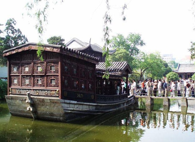 瓶形的水池是人工開鑿的,整個(gè)水池周長約1866米,面積約占全園面積的一半多。池水清澈,水池四周全部用明代城磚駁岸,顯得非常古雅。水池的南端,有一座長14.5米的仿木船式石肪。據(jù)說這座石舫是兩江總督尹繼善為了自己享樂,在清代乾隆十一年建造的。石舫上的“不系舟”匾額是當(dāng)年乾隆皇帝南巡時(shí)所題。中國有句古語: