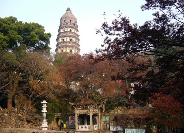 虎丘塔(云巖寺塔)現(xiàn)殘高48米,為八角仿木結構樓閣式七層磚塔,是江南現(xiàn)存唯一始建于五代的多層建筑,腰檐、平座、勾欄等全用磚造,外檐斗拱用磚木混合結構?,F(xiàn)塔頂軸心向北偏東傾斜約2.34米,據專家推測,因塔基巖在山斜坡上,填土厚薄不一,故塔未建成已向東北方傾斜,但斜而不倒屹立千年,被稱為中國的“比薩斜塔”。雖然站在塔內看不出有任何傾斜,但是如在塔內放一個球形物體時,可發(fā)現(xiàn)物體朝東北方向滾動。二山門為元代建筑,其結構尚承襲了宋代建筑的特色。脊桁為兩段圓木相接而成,故俗稱“斷梁殿”。其門扉、連楹、屋頂瓦飾及部分斗拱雖經后世修補,但仍保持了元代風格。