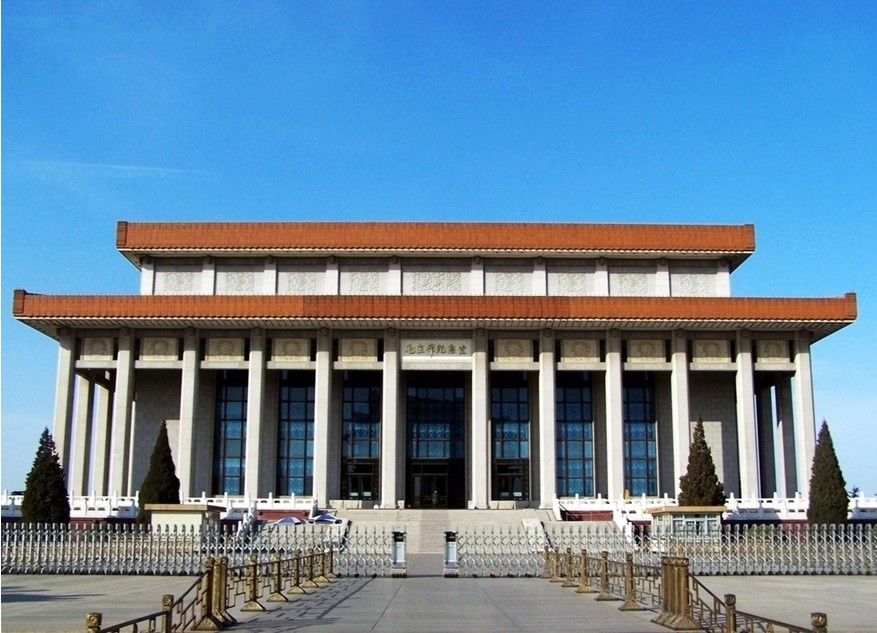 花崗巖砌成,基座高4米,座上矗立著17.5米高的44根花崗巖廊柱,承托著熠熠生輝的金黃琉璃重檐屋頂。在這座舉世矚目的輝宏殿堂里,安放著中華人民共和國的締造者毛澤東主席的遺體,每天前往瞻仰的中外賓客絡繹不絕。