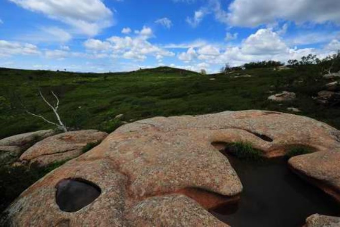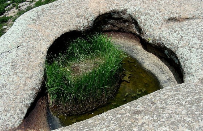 青山自然保護(hù)區(qū)位于海拔1574米的青山山體上,在山頂頂峰分布著各種各樣的冰臼,其平面上多數(shù)呈圓形、近圓形、橢圓形和不規(guī)則的形狀。有的象葫蘆,有的象梅花,有的象瓜子。一般冰臼口稍小,中下部較大,底多較平或呈鍋底微凹。形體“似臼”、“似盤”、“似盆”、“似匙”等,可以說應(yīng)有盡有。其中較深的冰臼多呈口小、肚大和底平特征??诓可暇墡в腥笨冢ɑ蜷_口),缺口有大有小,有深有淺。一般臼口寬約0.3~2米,深0.1~2米左右。最大的直徑達(dá)10.5米,深4.5米;最小的只有幾公分,似一般鈕扣大小。據(jù)調(diào)查統(tǒng)計(jì),在方圓不到2平方公里的范圍內(nèi),就有大小不一的冰臼1000多個(gè)。有的冰臼光潔如洗,無任何殘留物和充填物,但很多冰臼中,都填滿風(fēng)塵黃土物質(zhì),已長滿花、草或喬木、灌木,形成大小不同的“天然盆景”,置于堅(jiān)硬平坦的花崗巖山脊上,十分壯觀,給人極大的神奇感和奧秘感。