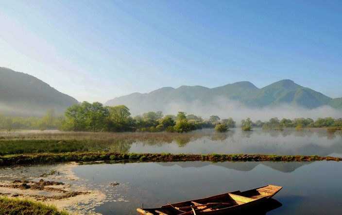 位于渝鄂交界處。是一片沼澤地—山澗盆地,是亞高山的一片濕地。面積3萬多畝,海拔1700米,面積36平方公里,南北長約15公里,東西寬約3公里,中間是一抹17平方公里的平川,四周高山重圍,在“抬頭見高山,地無三尺平”的神農(nóng)架群山之中,深藏著這樣的處女平地極為少見,大九湖因其享有“高山平原”的美譽,并被稱為湖北的“呼倫貝爾”、“神農(nóng)江南”,大九湖濕地公園總面積3萬畝,海拔1700米,園內(nèi)共分布有高等植物141科366屬964種(含變種及栽培種),其中國家重點保護植物共5種,國家珍貴樹種3種,苔蘚植物13科18種。