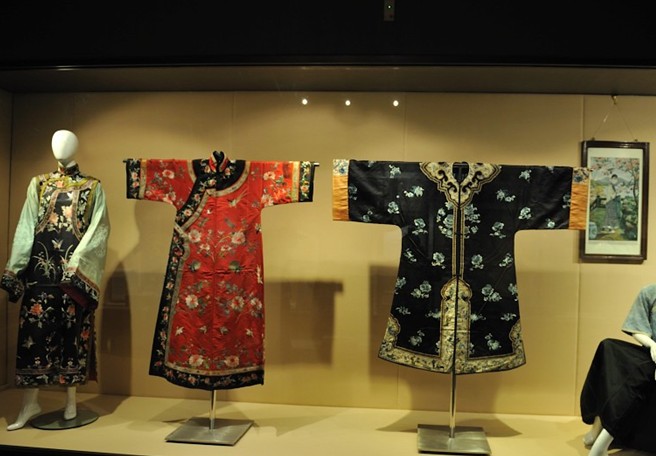 分“遵神循禮——錦衣繡服——家常日用”三部分,以絲綢服飾與歷代微縮服裝人物模型、圖板、象征性復(fù)原場(chǎng)景相結(jié)合的形式,形象地詮釋絲綢在古代社會(huì)的功用,展現(xiàn)戰(zhàn)國至清代流行的襖裙袍服、補(bǔ)服、龍袍等宮廷華服和家常日用繡品。