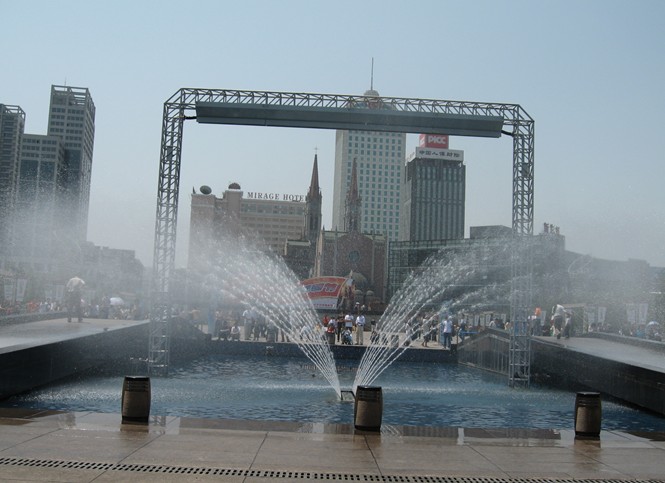 進(jìn)入廣場(chǎng)后跨過二座平行的小橋,便是亞洲最大的音樂噴泉和超大水幕電影??偼顿Y4000萬元的水景系統(tǒng)呈“L”型,總長(zhǎng)200米,主噴泉長(zhǎng)達(dá)95米,與廣場(chǎng)的中心舞臺(tái)遙相呼應(yīng),主噴泉的核心是兩座橋之間的號(hào)稱“擎天柱”的噴泉,中心的一支大口徑的噴嘴射出直徑達(dá)38毫米的水柱,噴高可達(dá)40米,形成一柱擎天之勢(shì);整個(gè)音樂噴泉有2000個(gè)噴嘴,400多臺(tái)水泵,全部由電腦控制,采用目前國(guó)際上最先進(jìn)的高壓氣泵式激光音樂噴泉技術(shù),噴泉在激光和音樂的配合下,能高速噴出一個(gè)個(gè)晶瑩透亮的水柱、水花、能組合出令人眼花繚亂的“高崗花式”、“華爾茲花式”、“蝴蝶展翅式”等幾百種噴泉花式,形成一個(gè)美不勝收的“水世界”;同時(shí)與噴泉交相輝映的水燈也大放異彩,隨著音樂的變化,一個(gè)赤橙黃綠青藍(lán)紫的“水光舞臺(tái)”,通透明亮,宛如仙境,令人目不暇接,贊嘆不已。在廣場(chǎng)的兩側(cè),噴射的水墻組成一個(gè)高20米,寬60米的扇形水幕,對(duì)面的建筑上射過來的一道光束和激光投射在晶瑩透明的水幕上,水珠如霰如霧,色彩斑斕的光束與水幕交相輝映,形成一組組生動(dòng)活潑的畫面——這就是天一廣場(chǎng)的大屏幕水幕電影,巨大的水幕電影中景觀人像清晰可感,恍如夢(mèng)境,又仿佛觸手可及,令人驚奇。