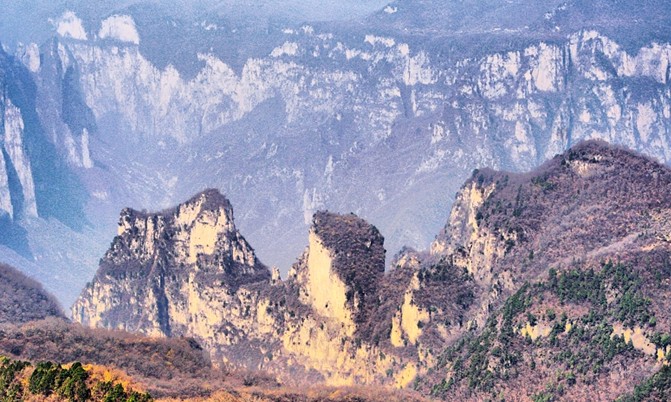 茱萸峰,俗名小北頂,峰頂有真武大帝廟、天橋、云梯。相傳,王維名詩(shī)《九月九日憶山東兄弟》:“獨(dú)在異鄉(xiāng)為異客,每逢佳節(jié)倍思親,遙知兄弟登高處,遍插茱萸少一人。”即于此峰有感而作。登上峰頂,極目遠(yuǎn)眺,可見黃河如銀帶;俯視腳下,群峰形似海浪涌。山頂氣候多變,倏忽間風(fēng)起云生,白霧從山間咕嘟嘟地涌出,紅日隨即隱去。山峰在云霧中出沒,云騰山浮,如臨仙界。峰腰有藥王洞,深30米,直徑10米,相傳是唐代藥王孫思邈采藥煉丹的地方,藥王洞口有古紅豆杉一株,高約20米,樹干粗達(dá)三人合抱,枝繁葉茂,樹齡在千年左右,是國(guó)內(nèi)罕見的名木。另有“廚灶洞”、“閻王洞”、“黃泥洞”等十余個(gè)洞穴。景點(diǎn)內(nèi)的名泉一斗水,泉狀若小井,水涌平地面,終年不涸不溢。另外,杜鵑峰、浮丘峰、翠微峰、云門峰也都各具特色。