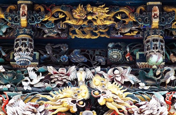 尤其是大殿檐下兩側的二龍戲珠、鳳凰牡丹,雕刻得最為精彩。蒼龍騰云駕霧、鳳凰振翅欲飛。龍頭鳳首突出于畫面之外,伸向空中。工人們匠心獨到地采取圓雕手法(民間稱為懸雕),使龍與鳳的造型適應多角度欣賞,這樣的技藝手法使龍鳳更具立體感、韻律感、跳躍感。
