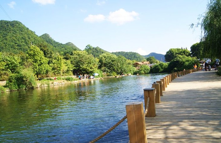 ?。?)螃蟹井—穆家壩河灘景觀:該景觀以彎曲河道水面為主體,其間具有賓館,螃蟹井、村寨、孤丘組景。該景觀的原始風(fēng)貌獨(dú)具一格,河水碧綠迂回,兩岸秀山并列,山澗螃蟹井水流涓涓,農(nóng)田稻花滾滾,苗圃翠新,大有“穿花復(fù)繞水,隔岸聞花香”風(fēng)光。版權(quán)所有山東聊城聊之旅國際旅行社有限公司,轉(zhuǎn)載必究!在吉林賓館一帶。更是綠樹成蔭,草坪蔥蔥,姐妹峰則是古藤繞崖,螃蟹井布依農(nóng)舍更反映了布依山寨特色。