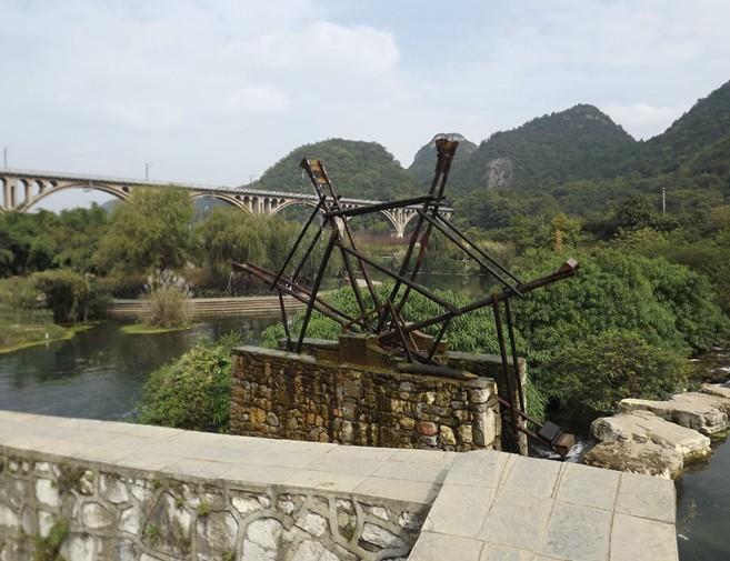 ?。?)團(tuán)寨河灘景觀:該景觀由三級跌水以及石橋殘部組成。上層水面開闊平緩,兩岸柳木夾岸。旁邊一小山包林木蔥郁。