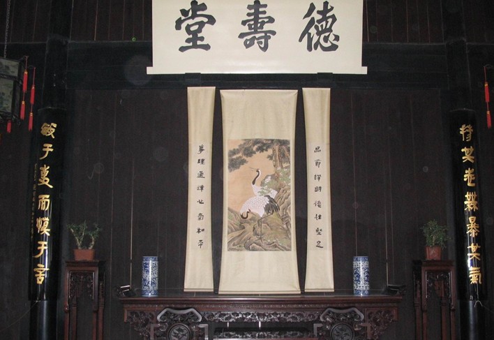 第二進(jìn)為廳堂,俗稱“大堂前”,是周氏族人的公共活動(dòng)場(chǎng)所,以作喜慶、祝福和宴會(huì)賓客之用。廳堂正上方高懸一塊大匾“德壽堂”,兩旁柱子上有一副紅底黑字的楹聯(lián):