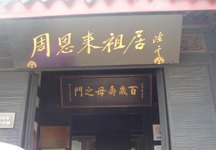 周恩來(lái)祖居,在浙江省紹興市區(qū)保佑橋河沿即今勞動(dòng)路東首,是一幢坐北朝南具有明代建筑風(fēng)格的磚瓦房,富有傳統(tǒng)特色的黑色竹絲臺(tái)門(mén)。祖居外觀古樸莊嚴(yán),共三進(jìn),每進(jìn)三間房。兩進(jìn)之間各有天井相隔,天井兩側(cè)有小廊對(duì)拱。第一進(jìn)中間為臺(tái)斗門(mén),左右為耳房。第二進(jìn)為大廳。第三進(jìn)原為樓房,倒塌后,改建平房?,F(xiàn)為浙江省愛(ài)國(guó)主義教育基地、紹興市學(xué)校德育基地。周恩來(lái)生前多次說(shuō)“我是紹興人”,稱(chēng)紹興為自己的故鄉(xiāng)。據(jù)方志記載,保佑橋周氏是明嘉靖年間遷居紹興城內(nèi)的。