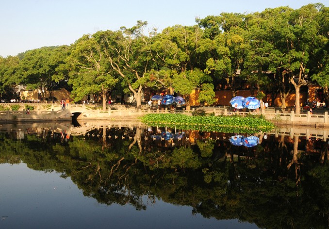 蓮花池三面環(huán)山,四周古樟參天,池水為山泉所積,清瑩如玉。每當(dāng)盛夏之際,池中荷葉田田,蓮花亭亭,映襯著古樹、梵宇、拱橋、寶塔倒影,構(gòu)成一幅十分美妙的圖畫。夏季月夜到此,或風(fēng)靜天高,朗月映池;或清風(fēng)徐徐,荷香襲人。