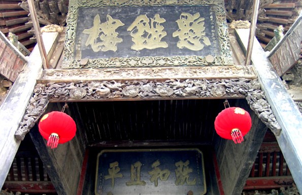 這分別是鐘樓和鼓樓,相對(duì)稱坐落于懸鎰樓兩側(cè),鐘樓內(nèi)懸大鐘一口,鐘高5尺,重2千余斤,人稱聚將鐘,亦稱“金鐘報(bào)曉”,鼓樓在西側(cè),內(nèi)懸掛更鼓一面。