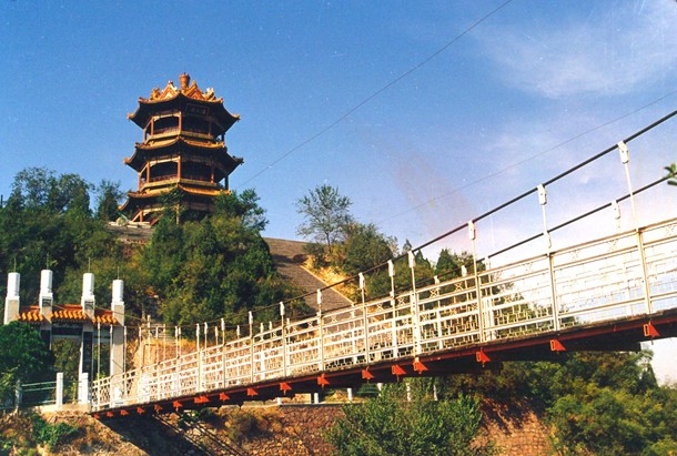 位于五龍峰東部約1.5公里處,主要游覽點(diǎn)有紫金閣、鐵索橋、牡丹園、月季園、植物園等。紫金閣分三層,高33米,每逢節(jié)日,紫金閣頂?shù)囊豢诤殓姂?yīng)和著黃河的波濤發(fā)出宏亮的聲響,聲聞數(shù)里。在岳山寺的懸崖峭壁之間架有一座鐵索橋,橋長(zhǎng)40米,極為險(xiǎn)峻。