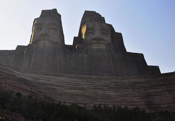 是目前國(guó)內(nèi)最雄偉的雕塑之一。它依山就勢(shì),以山為體,82米高的整座向陽(yáng)山作為像身,再在山頂塑造18米高的頭像,總高達(dá)到100米。構(gòu)思新穎,獨(dú)具匠心,不同凡響。二帝坐南朝北,背依邙山,面對(duì)黃河。巨像前是一個(gè)開闊場(chǎng)地,周圍遍植松柏,中間建筑祭壇。祭壇至塑像的軸線上建有長(zhǎng)200米的神道,兩側(cè)各列四座鑄銅大鼎,連同山前一座共九鼎,寓意九州四方江山永固。廣場(chǎng)東西兩端擺放大型編鐘、銅鼓各一個(gè)。
