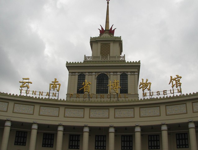 云南省博物館于1964年建成使用。它是一座主樓七層,兩翼三層的寶塔式建筑,通高40余米。大樓一至三層為展廳,面積共4200平方米,前面是12根合抱粗的圓形大柱,屋頂金色剎桿燦燦,紅星閃爍,氣勢雄偉,造型別致。