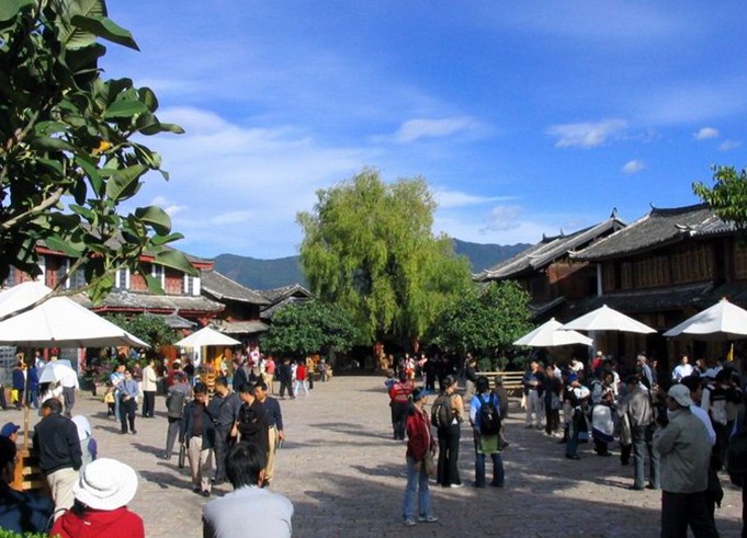 四方街是麗江古城心臟,交通四通八達(dá),周圍小巷通幽,據(jù)說是明代木氏土司按其印璽形狀而建。這里是茶馬古道上最重要的樞紐站。明清以來各方商賈云集,各民族文化在這里交匯生息,是麗江經(jīng)濟(jì)文化交流的中心。這里是歷代集市中心,每日萬頭躦動(dòng),熱鬧非常。從四方街四角延伸出四大主街,直通東南西北四郊,又從主街岔出眾多街巷,如蛛網(wǎng)交錯(cuò),往來暢通。街道全用五彩石鋪砌,平坦?jié)崈?,晴不揚(yáng)塵,雨不積水。幾乎每條街道一側(cè)都伴有潺潺流水。由此形成以四方街為中心,四周店鋪客棧環(huán)繞,沿街逐層外延的稠密而又開放的格局,古老的集市就這樣孕育了城市最初的形狀,這與中國(guó)傳統(tǒng)的四四方方的井字形街道是不是一樣的。