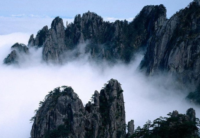 云海:晴空萬(wàn)里時(shí),白云從千山萬(wàn)壑中冉冉升起,蒼茫的云海猶如雪白的絨毯,緩緩地鋪展在地平線上,光潔厚潤(rùn),無(wú)涯無(wú)邊。山風(fēng)乍起時(shí),云海四處飄移,群峰眾嶺變成云海中的座座小島;云海聚攏過(guò)來(lái)時(shí),千山萬(wàn)壑隱藏得無(wú)影無(wú)蹤。云海時(shí)開(kāi)時(shí)合,恰似“山舞青蛇”,氣象十分雄偉。