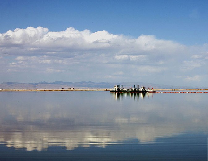萬丈鹽橋道寬路長,風(fēng)光無限。人們乘車來到這里,只見筆直坦蕩的路橋,象一把利劍將浩瀚的鹽湖一劈兩半。鹽橋兩旁有鉀肥廠的廠房,宿舍,有溝壑一般的采礦點,不遠(yuǎn)處還有舉世聞名的青藏鐵路,一列列長蛇似的火車,吞云吐霧,鳴鳴吼叫著從湖面上飛馳而過。