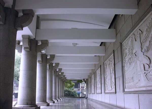 新館用融合的方法處理新舊建筑的關(guān)系,以原陳列大樓為中心,圍合前庭,強(qiáng)化兩翼,對(duì)稱布局,形成三殿式建筑,集簡(jiǎn)練、穩(wěn)重、統(tǒng)一于一體,秩序感極強(qiáng)。