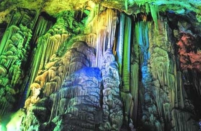進(jìn)入洞中,人的心情驟然緊張而又企盼著什么,難以名狀。只見在彩燈的折射下,奇石林立,五光十色,令人眼花繚亂,大有美不勝收之感。什么天宮、龍宮、玉免宮……