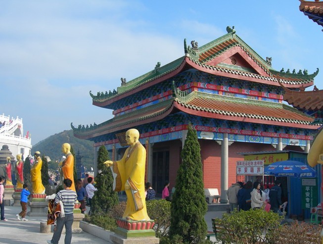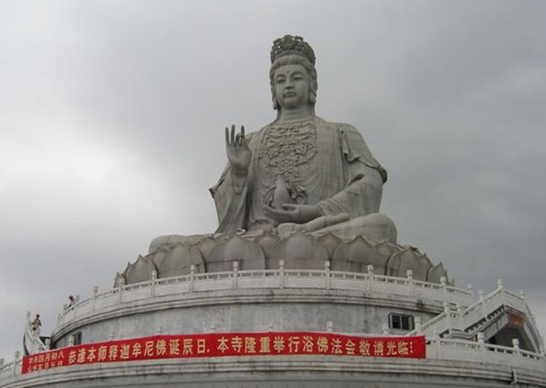 觀音廣場位于488米的觀音山頂,占地面積10000平方米,視野開闊,花繁葉茂,空氣清新,四季宜人。觀音菩薩圣像,就是目前全國乃至全世界最大的花崗巖觀音菩薩雕像。這尊觀音菩薩的圣像主題高33米,橫截面寬10.2米,體積有630立方米,總重3300噸,是由999塊0.5至8噸不等的福建蒲田優(yōu)質(zhì)花崗巖拼裝而成。圣像由國家一級雕塑師陳寶如設(shè)計,全部采用人工雕鑿,從1997年9月動工,至2001年6月竣工,歷時四年,總工日達(dá)98600個。