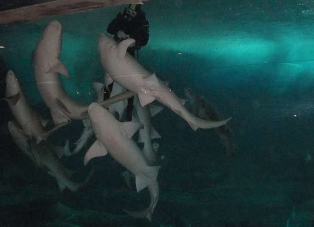 當(dāng)您步進(jìn)900立方米水體的鯊魚館,看到各種各樣的鯊魚,當(dāng)然最驚險(xiǎn)刺激的,還是潛水員在鯊魚池里給鯊魚喂食,聞到魚腥味的鯊魚圍著潛水員轉(zhuǎn)來(lái)轉(zhuǎn)去,爭(zhēng)搶潛水員帶來(lái)的小魚。