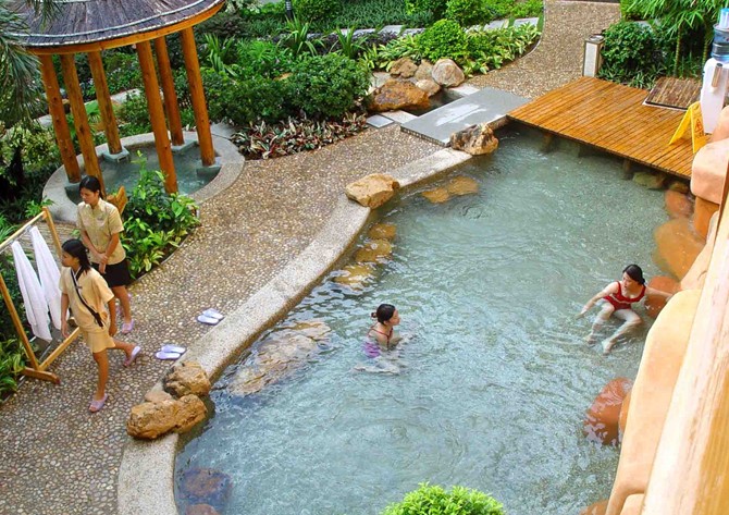 依山而建的古兜溫泉,集山、泉、湖、海為一體,風(fēng)景優(yōu)美,有著豐富的溫泉資源,在古兜山下新近落成的溫泉谷,格調(diào)高雅,打造出一個(gè)不同凡響的溫泉王國。溫泉谷中間有一條約150米長的人工鵝卵石河道,它不僅為景區(qū)增添了春山幽谷的野趣,更和中央水區(qū)的大舞臺及各大小泡池相連,將谷內(nèi)建筑群落自然分成了三大區(qū)域:北邊是歐式風(fēng)格的“羅馬殿”,東邊則是日本和式風(fēng)格的“東瀛閣”,南邊是“唐宮”。