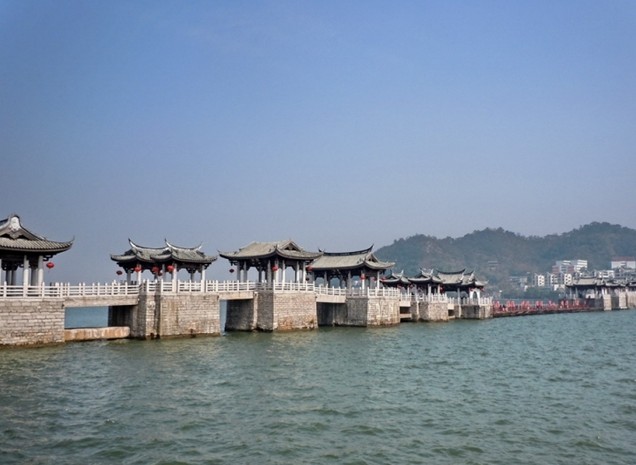 紹熙五年 (1194年),太守沈宗禹“皤石東岸”,筑“蓋秀亭”,并稱東橋?yàn)?lsquo;濟(jì)川橋’,接著,太守陳宏規(guī)、林驃、林會(huì)相繼增筑,至開禧二年(1206年)歷時(shí)十二年,建成橋墩十三座。東西橋建起來后,中間仍以浮舟連結(jié)之,形成了梁橋與浮橋相結(jié)合的基本格局。