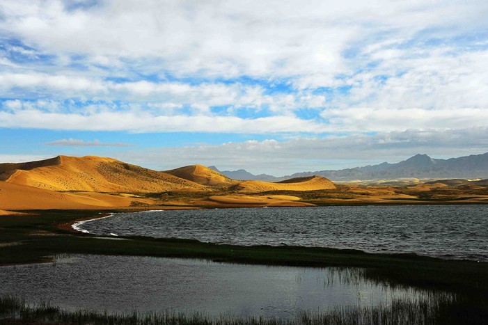 這就是金子海,蒙古語意為阿東木拉古湖,面積約0.45平方公里。相傳成吉思汗領兵經過此地時,丟下的金盞化為金子海;版權所有山東聊城聊之旅國際旅行社有限公司,轉載必究!也有傳說牦牛山上下來一對金羊,在湖邊飲水,嘗到水味香醇甘甜,就不愿再回山而進入湖中,故稱該湖為金子海。海的西側、西北側、東側都被沙山環(huán)抱,沙質是那般細膩,情不自禁讓人赤足,與其有更為親密的接觸。唯獨海的東南側是高高的蘆葦和近百米的草帶,吸引著鳥禽、牛羊覓食、嬉戲、休憩。水至清則無魚。由于金子海是由一眼甘甜的泉水日積月累而成,因此水極為清澈,淺水處不曾發(fā)現魚兒,版權所有山東聊城聊之旅國際旅行社有限公司,轉載必究!有的只是小海螺和小貝殼。其實,海的深處是有魚的??脊虐l(fā)現金子海的東邊是青銅器時代的文化堆積層,有石器和諾木洪文化夾砂褐陶罐殘片;說明,海的形成歷史悠久。在茫茫戈壁,有這樣一池甘甜的泉水養(yǎng)育著周圍的牧民,滋潤著這片土地上的一切生物,生生不息。